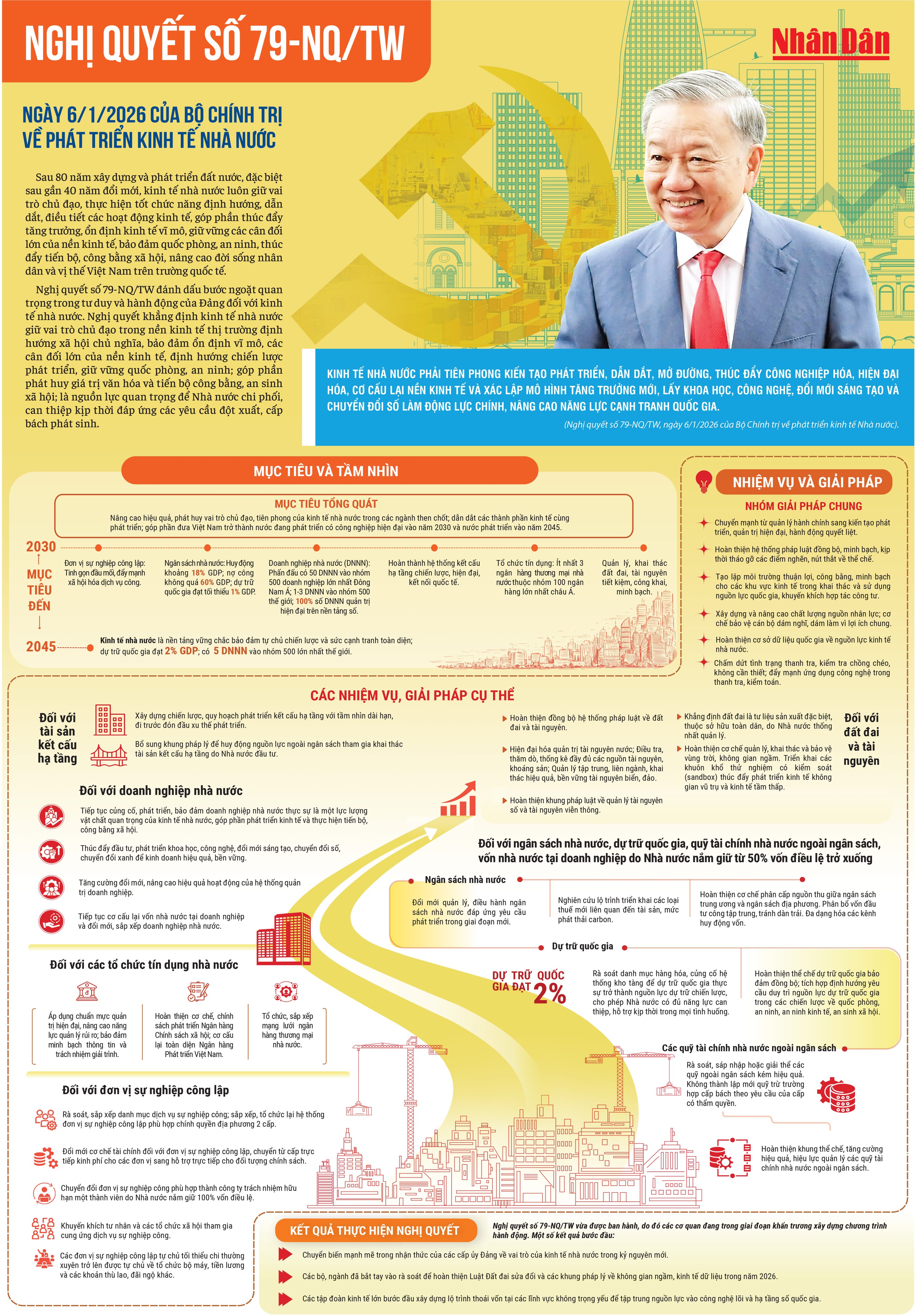 Nghị quyết đặt ra những cột mốc định lượng cụ thể, thể hiện tầm nhìn xa và khát vọng lớn của Đảng. Trong đó, đến năm 2030: Phấn đấu có 50 doanh nghiệp nhà nước lọt nhóm 500 doanh nghiệp lớn nhất Đông Nam Á và ít nhất 1 - 3 doanh nghiệp nhà nước vào nhóm 500 doanh nghiệp lớn nhất thế giới. Hệ thống ngân hàng cũng đặt mục tiêu có ít nhất 3 ngân hàng thương mại nhà nước nằm trong Top 100 khu vực Châu Á. Về quản trị, 100% DNNN phải thực hiện quản trị hiện đại trên nền tảng số và áp dụng các nguyên tắc quản trị của OECD. Tầm nhìn 2045, Kinh tế nhà nước sẽ trở thành nền tảng vững chắc bảo đảm tự chủ chiến lược và sức cạnh tranh toàn diện của nền kinh tế, góp phần đưa Việt Nam trở thành nước phát triển, thu nhập cao.